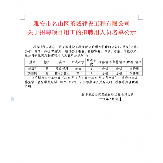 雅安市名山區(qū)茶城建設工程有限公司 關于招聘項目用工的擬聘用人員名單公示